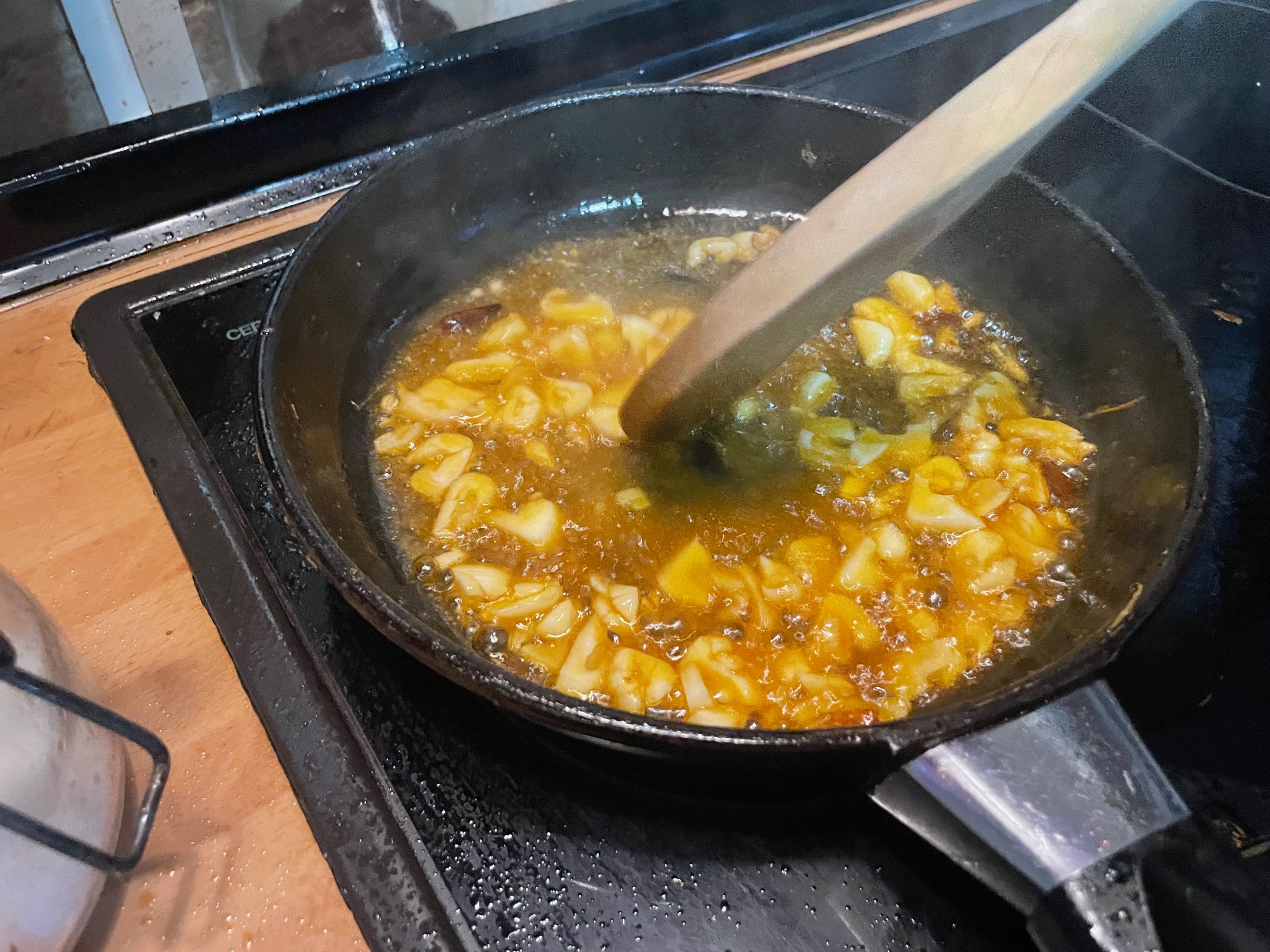En ese jugo doramos los ajos y las cayenas
