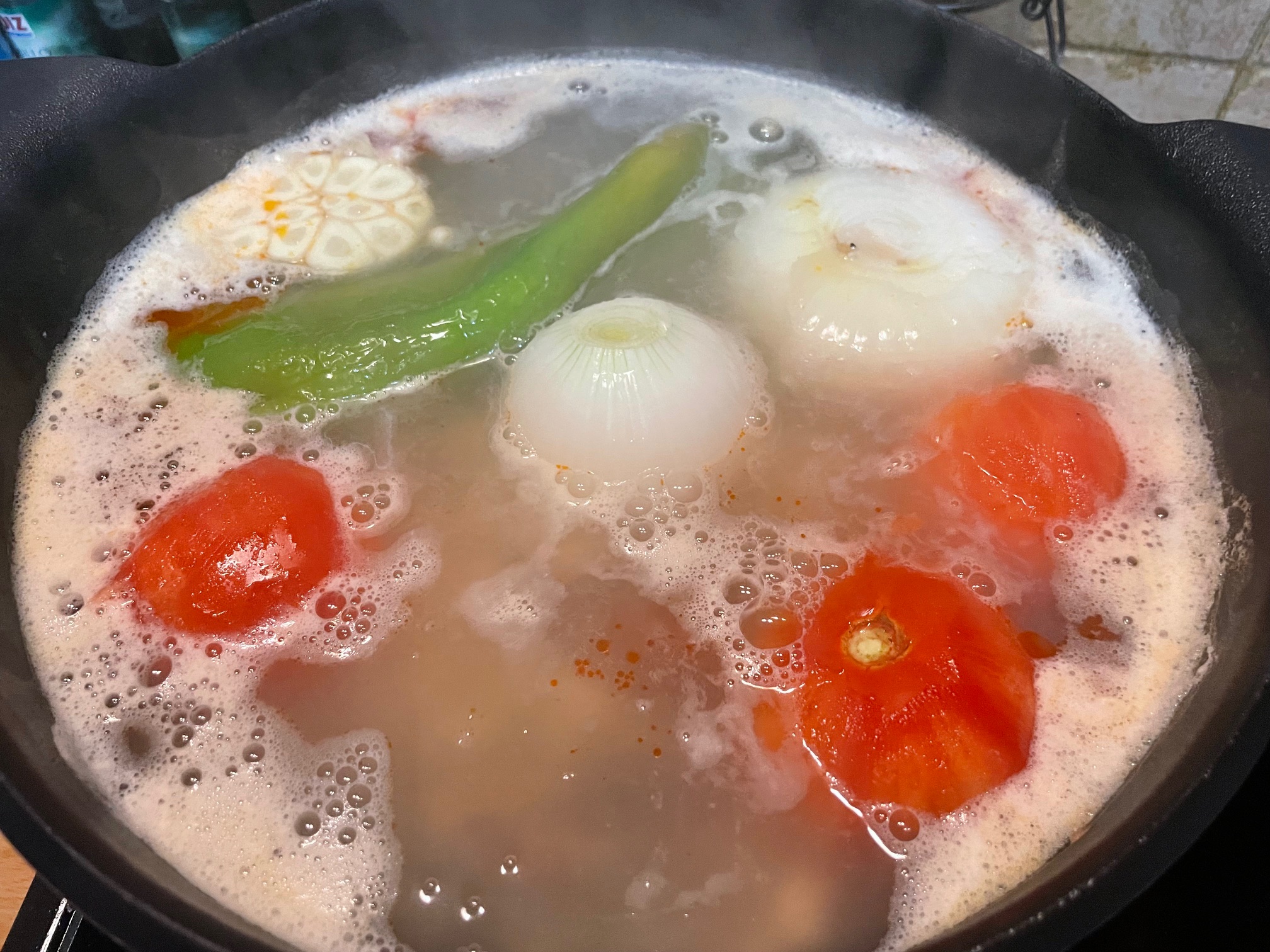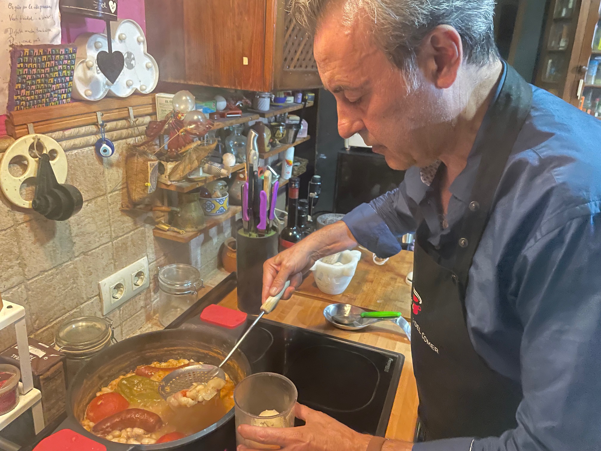 Cuando empieza a hervir el guiso, “lo asustamos” añadimos tres vasos de agua para parar la cocción