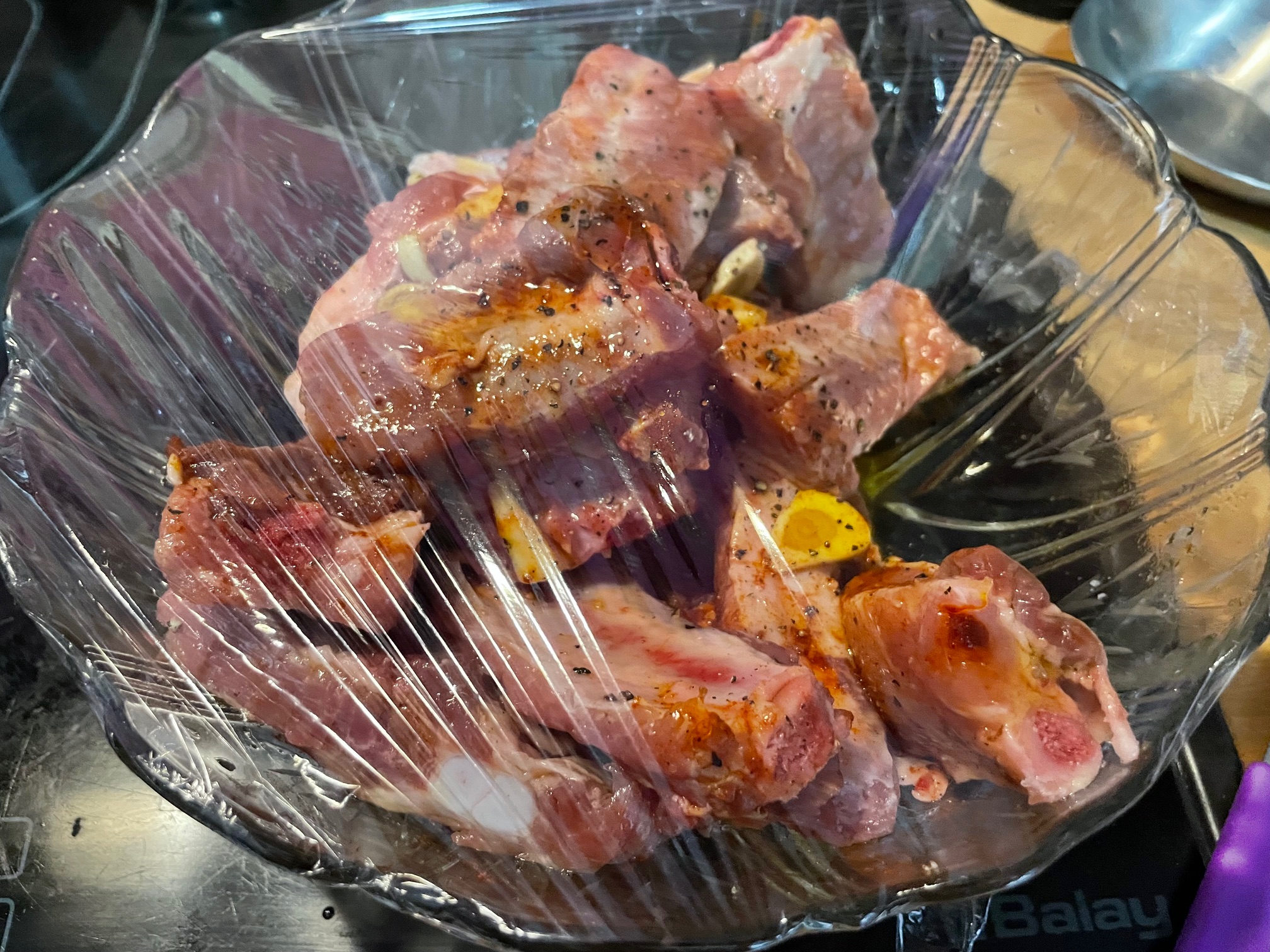 En un recipiente salpimentamos las costillas, le añadimos el Pimentón de la Vera, una hoja de laurel, salsa inglesa y el zumo de limón. Metemos en la nevera 1 hora.