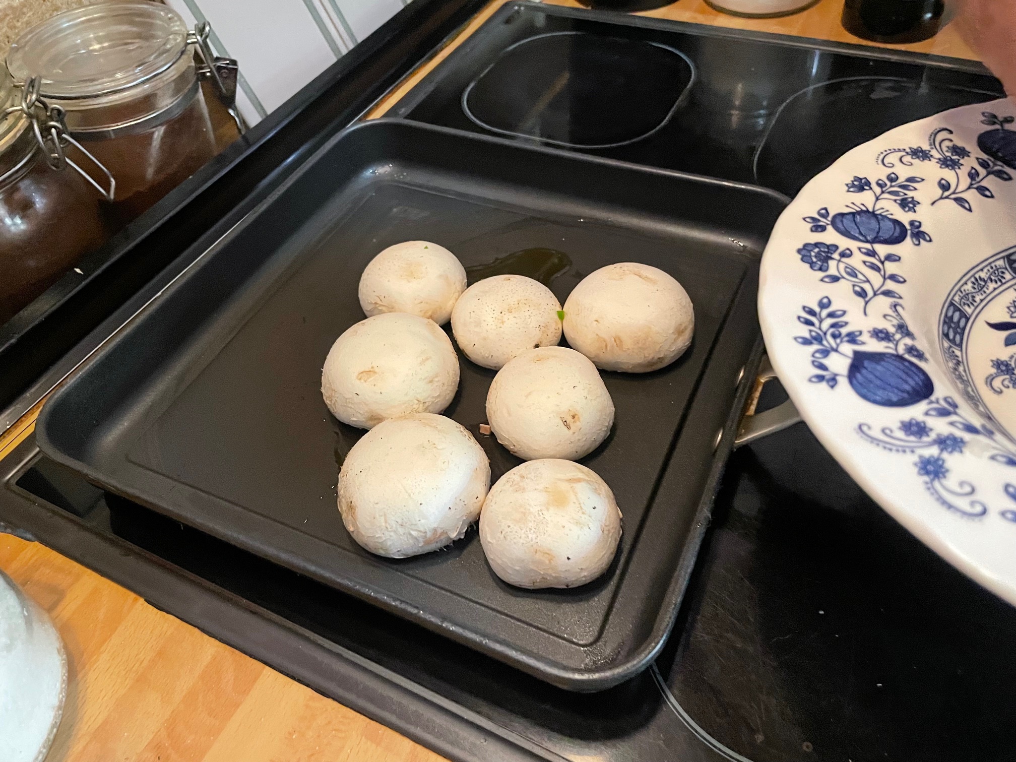 Ponemos los champiñones en la plancha o en la sartén y los doramos por los dos lados