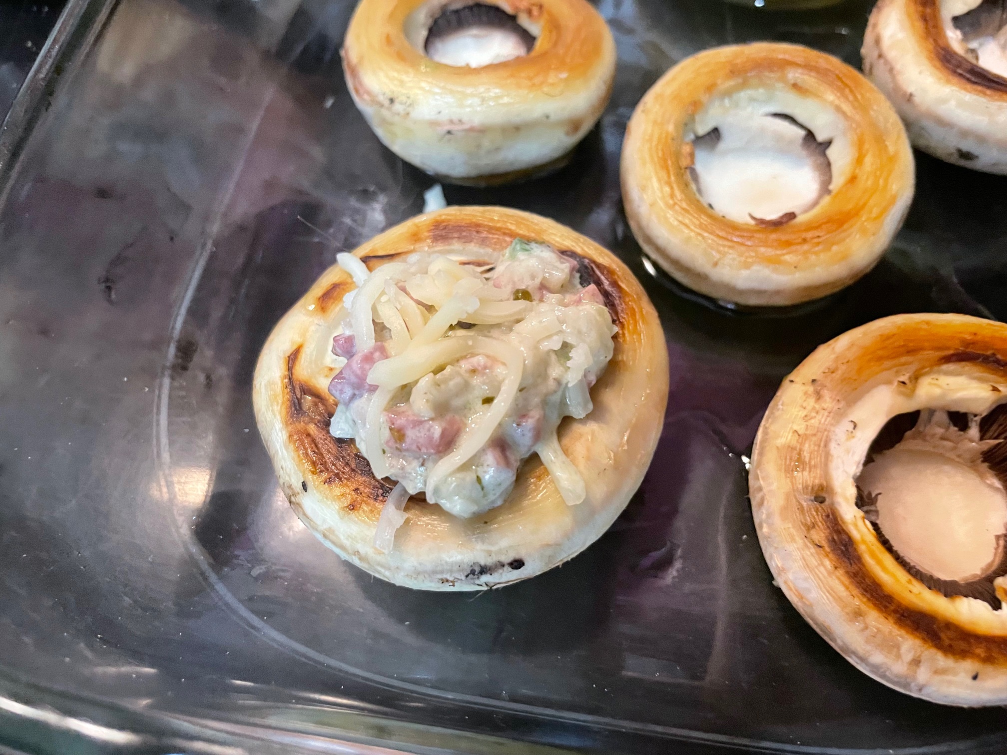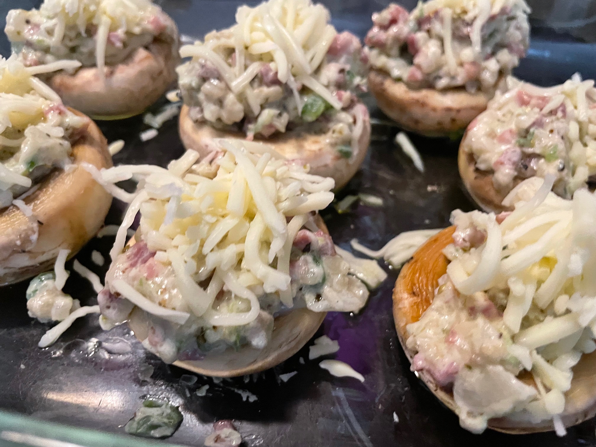 Rellenamos los champiñones, primero ponemos en la base un poco de mozzarella, luego el relleno y cubrimos con más mozzarella