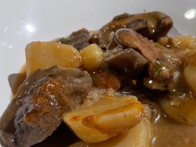 Carrilleras con verduras y champiñones al vino tinto